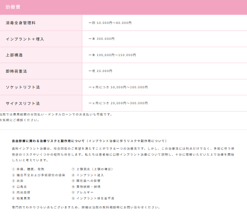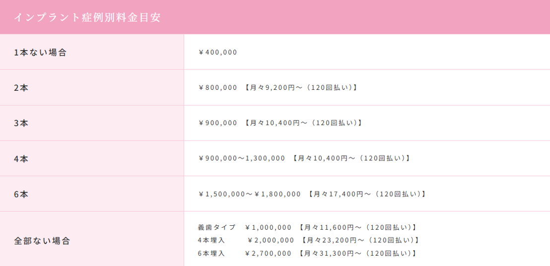 インプラントの費用は、インプラント埋入のために必要な施術ごとに費用がかかります。 費用の総額は、患者様の状態によって「何本インプラントを埋め込むか」「骨造成などの手術を何箇所行うか」が変わってきます。